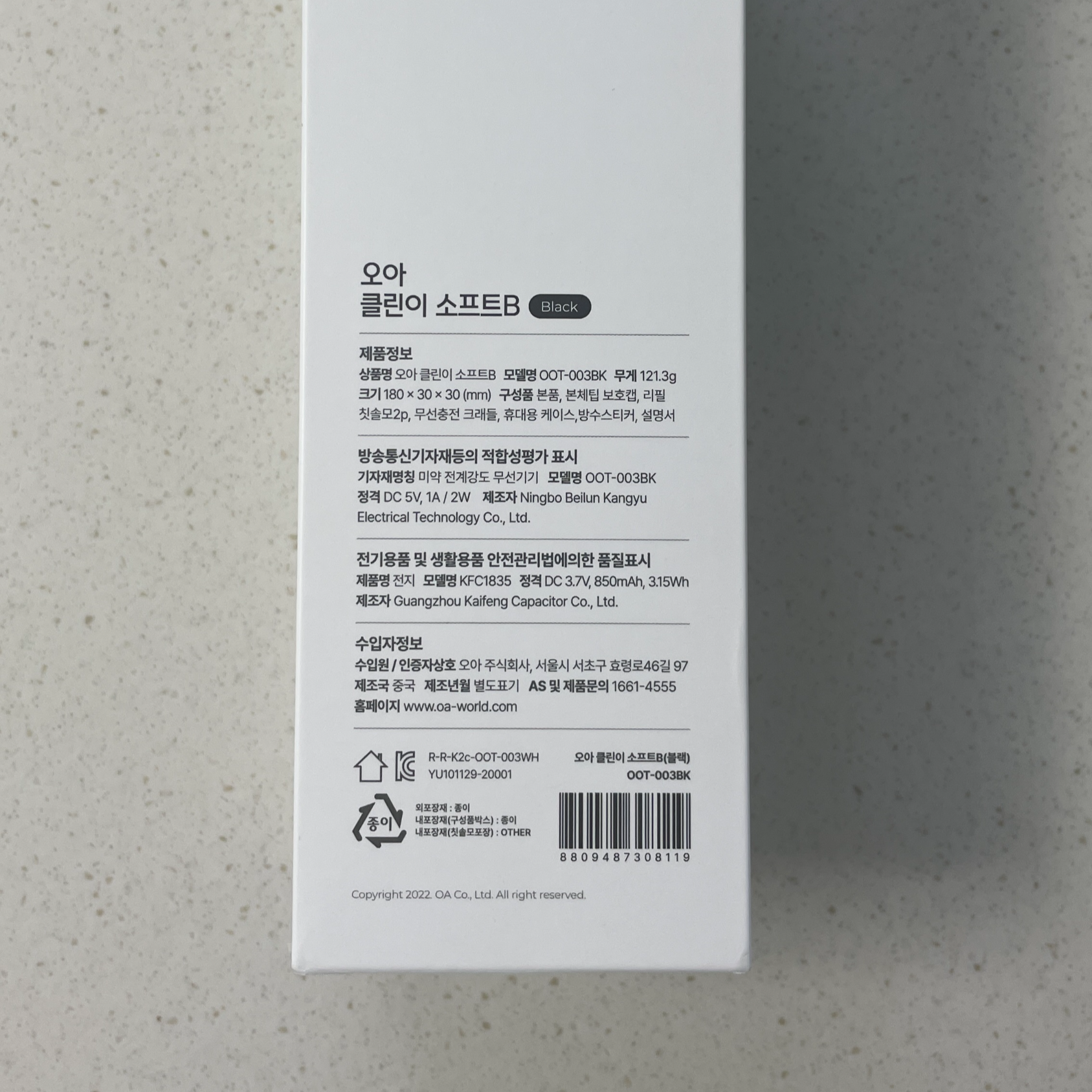 깨끗한 치아관리를 위해서 오아공식몰에서 구매한 오아 전동칫솔 클린이 소프트 B입니다.